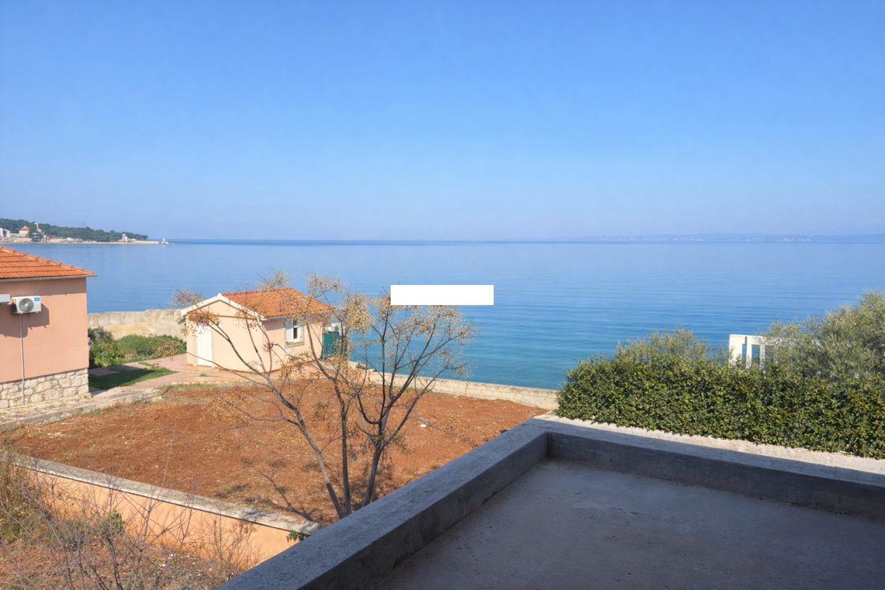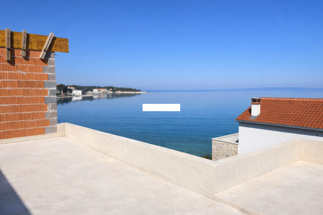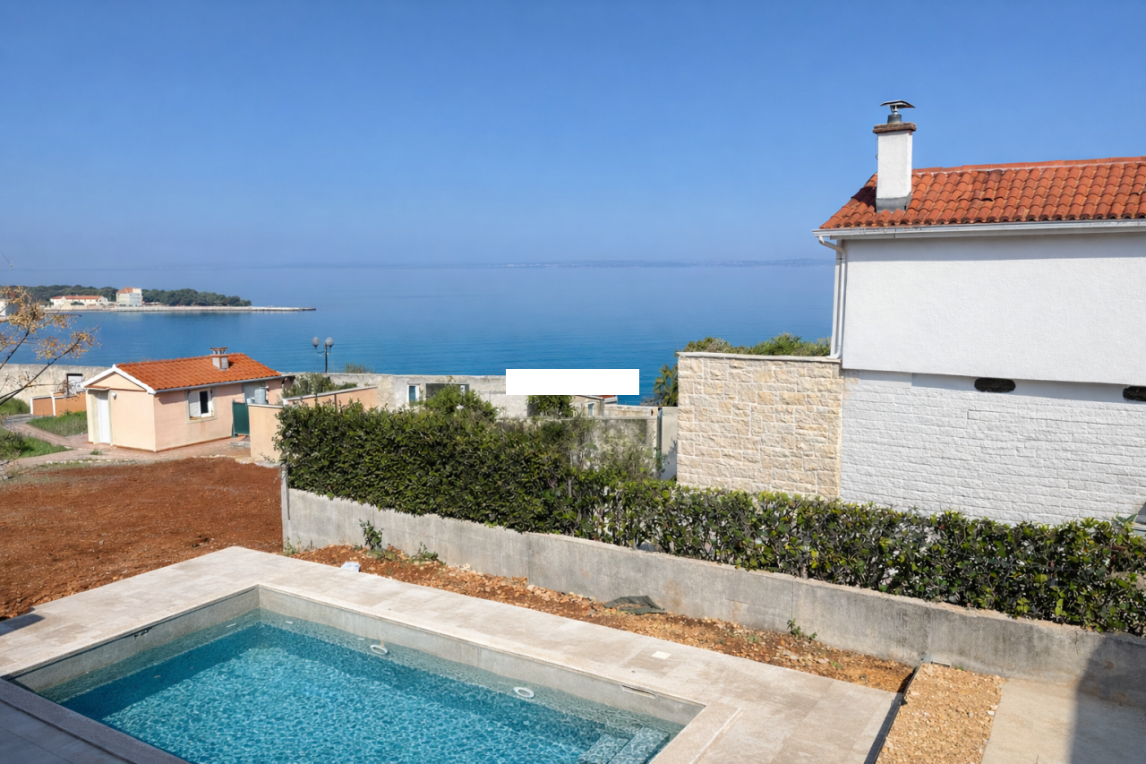 On the first floor there are three bedrooms, two bathrooms, and a covered terrace with a nice sea view. A special highlight is the rooftop terrace, which offers panoramic views stretching across the sea toward Zadar and the Velebit mountain range. Each residential unit also includes two parking spaces. In front of the villa there is a house that blocks the direct view from passers-by and preserves the privacy of the ground floor.
