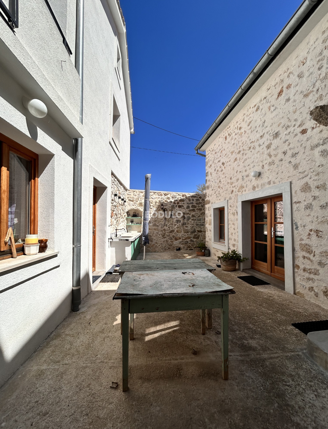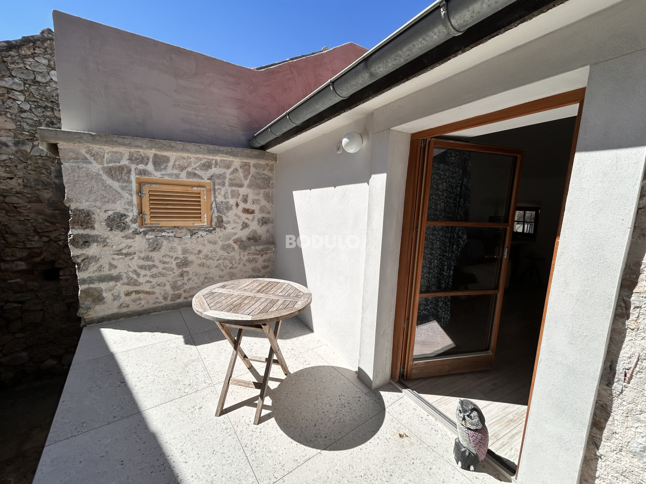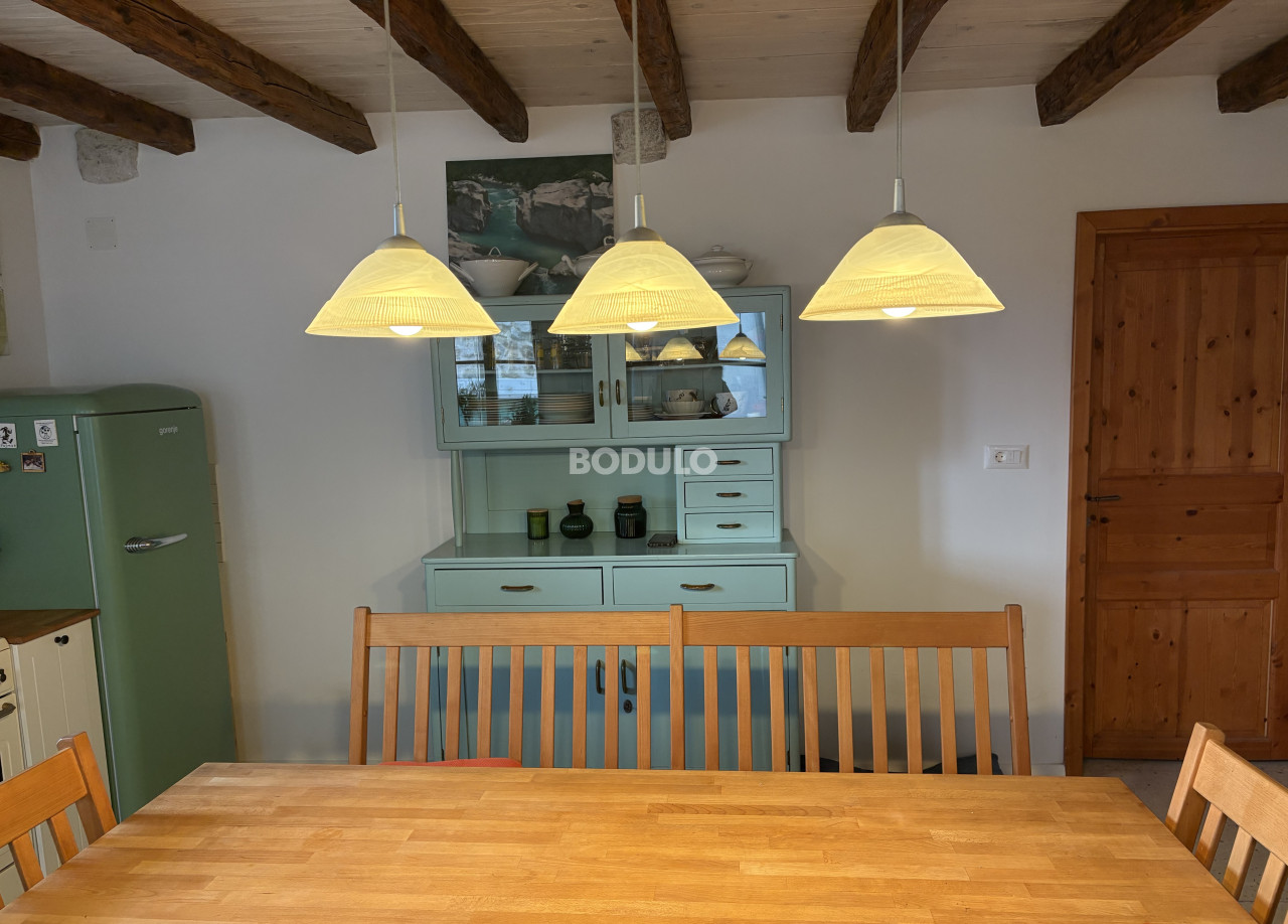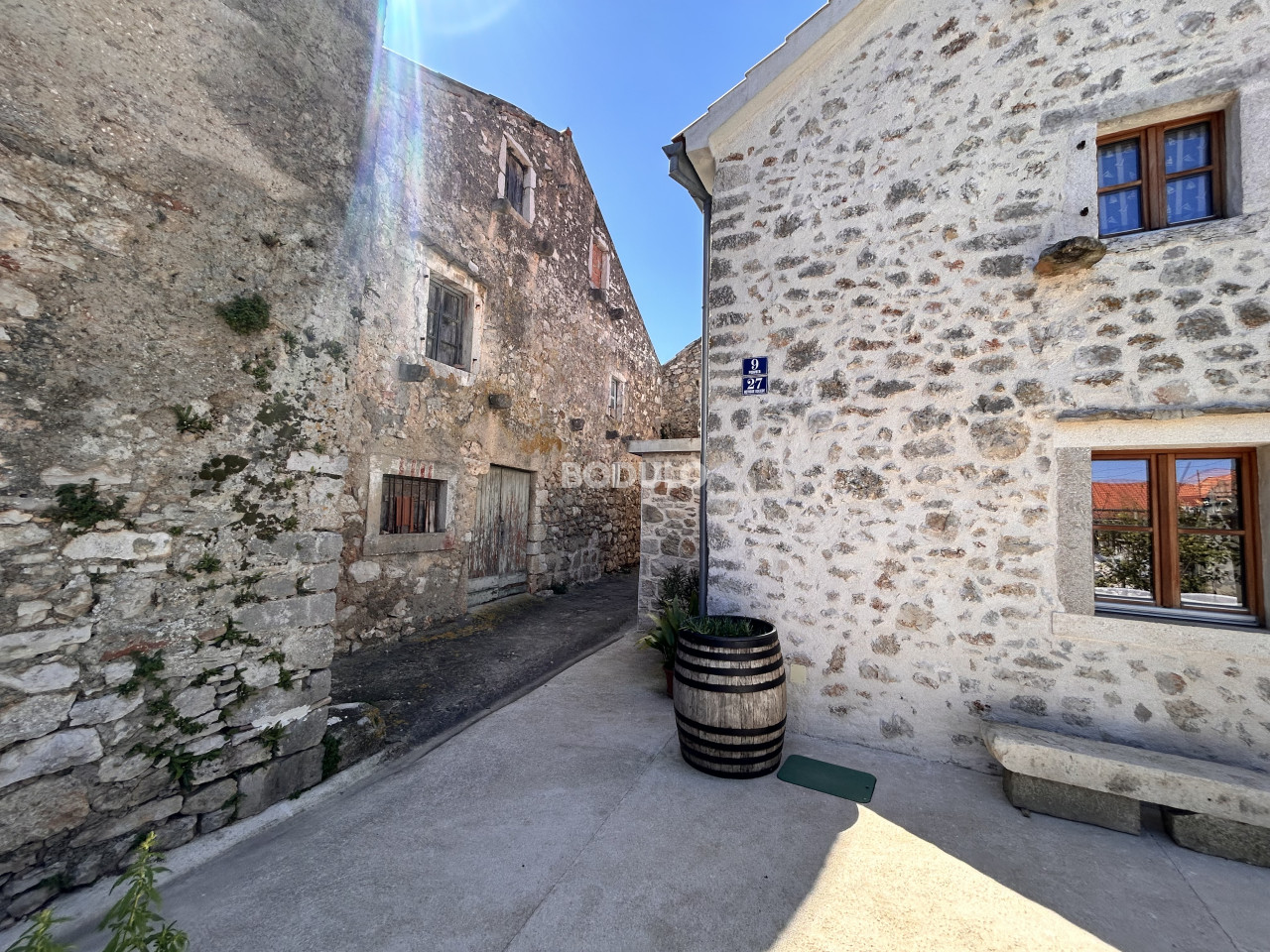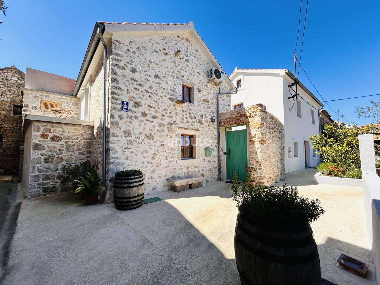 Dvorište je lijepo uređeno - u kamenom dijelu površine 56m2 ima vanjsku kuhinju, a preostalih 300m2 odnosi se na prostor za parking i uredan i održavan vrt, što dodatno doprinosi ugođaju boravka na otvorenom. Nekretninu krase tradicionalni kameni detalji i mirna lokacija, a blizina mora čini je posebno atraktivnom.