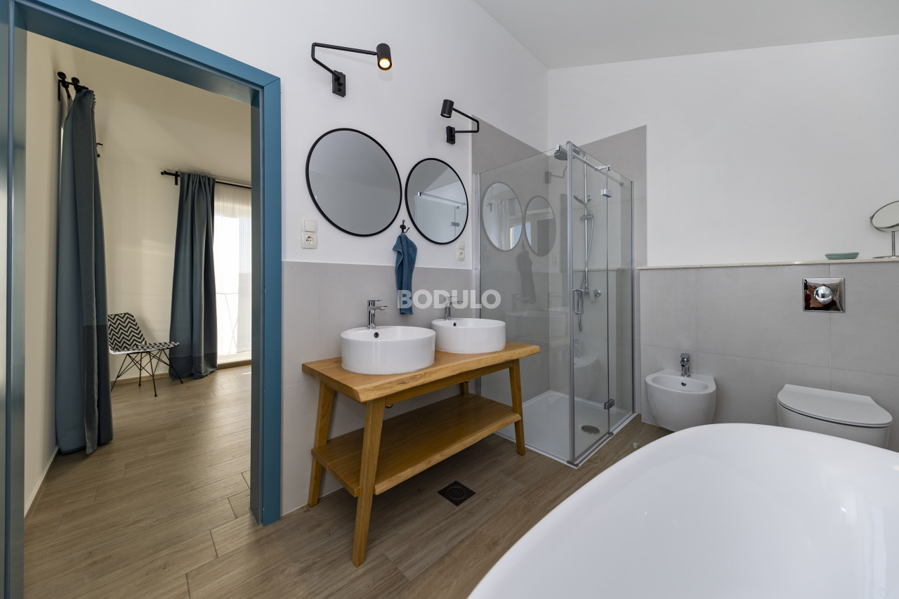 The ground floor consists of a spacious living room in the central part, a fully equipped kitchen and dining room, a hallway, a large bedroom with an attached bathroom, and another multifunctional room in which there is a children's playroom, which can easily be transformed into a study, an additional bedroom or a fitness area (all according to the wishes of the future owner). There is also a wardrobe, a laundry room and a guest toilet here, and the total living area of the ground floor is approximately 168 m2.