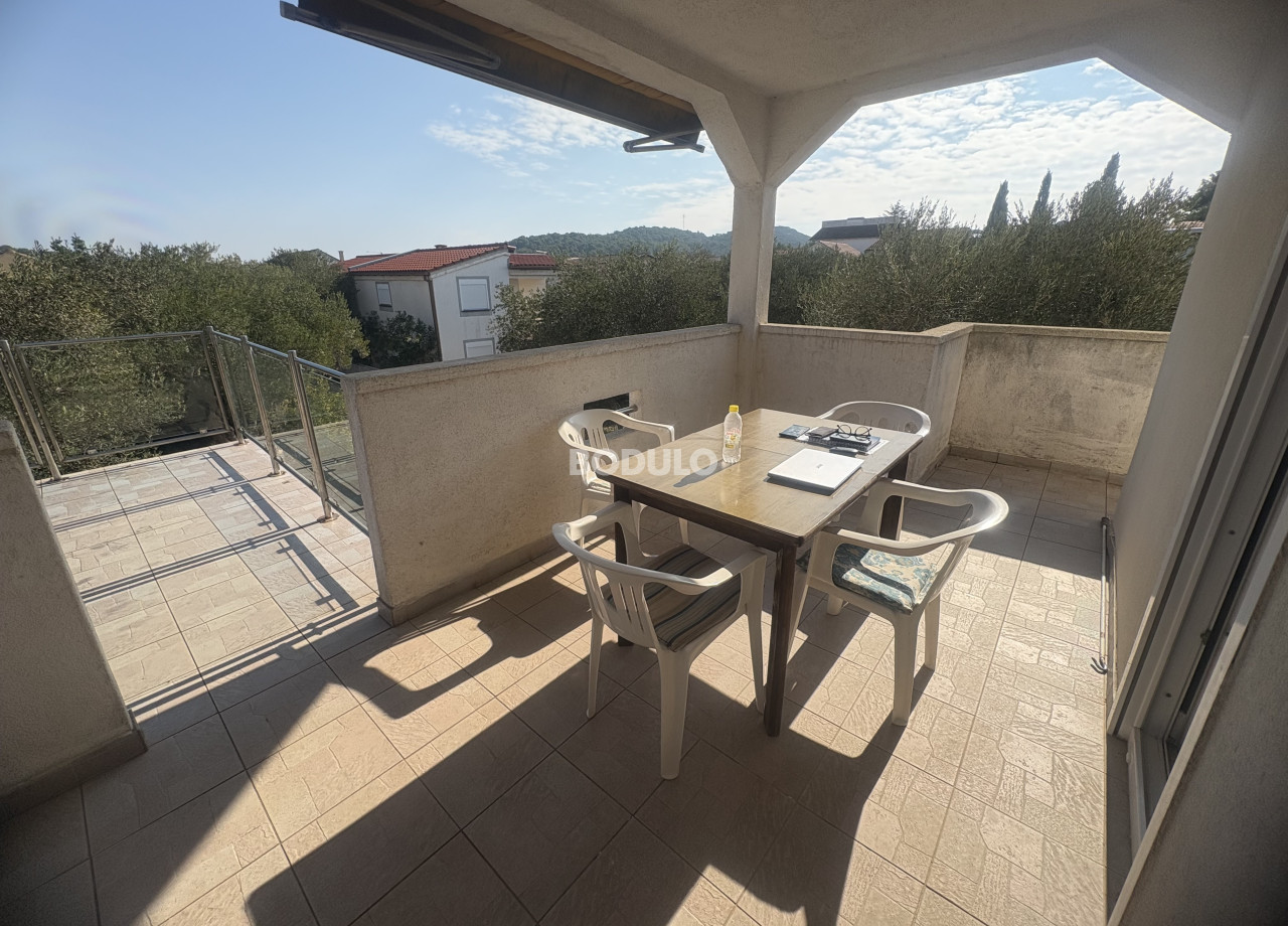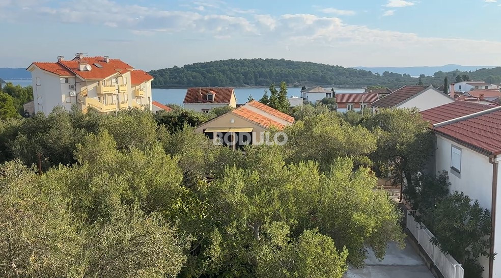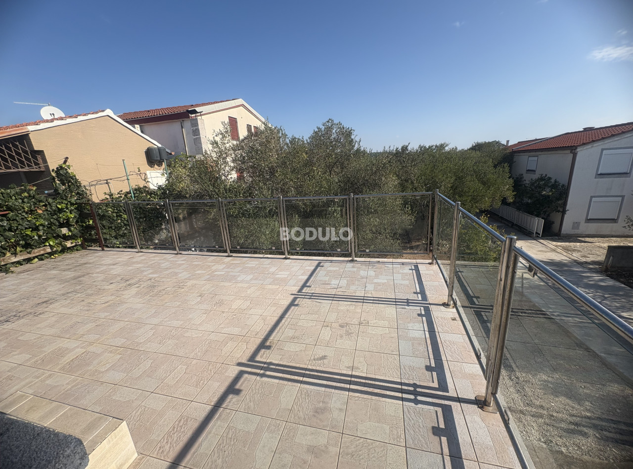 The house sits on a plot of 172 m² and consists of a ground floor and an upper floor, each with a separate entrance. On the ground floor, there is a one-bedroom apartment of approximately 40 m², comprising a bedroom, bathroom, a small kitchen, and a living room with access to the terrace and courtyard. The upper floor features a two-bedroom apartment of around 40 m², with a spacious partially covered terrace of about 45 m², offering a lovely view of the sea and the surrounding landscape. From this terrace, an external staircase leads to an additional rooftop terrace of 12 m², which offers an exceptional panoramic view of the sea, the Pašman Bridge connecting the islands of Pašman and Ugljan, and the village of Ždrelac itself.