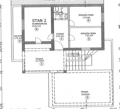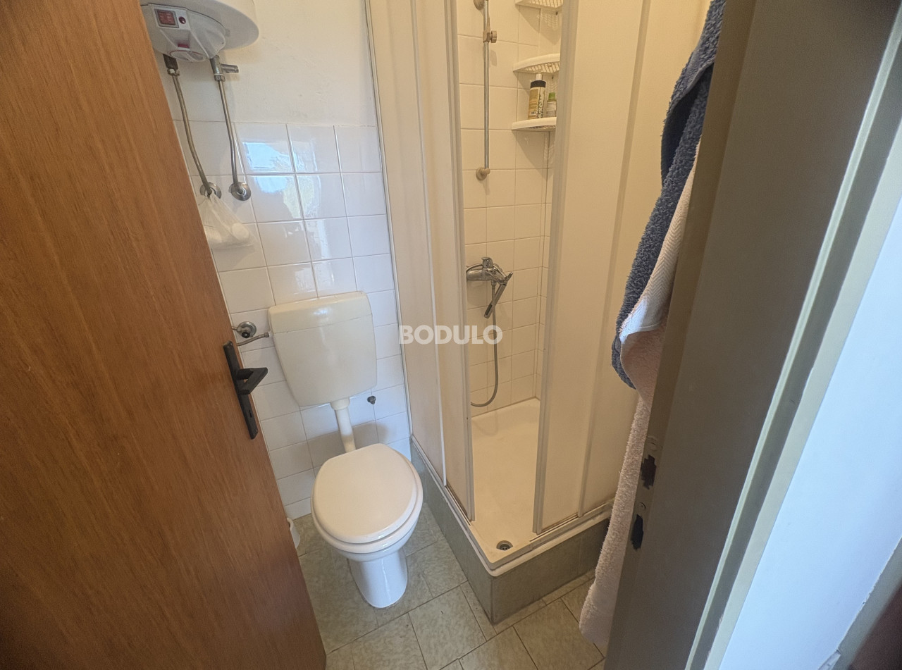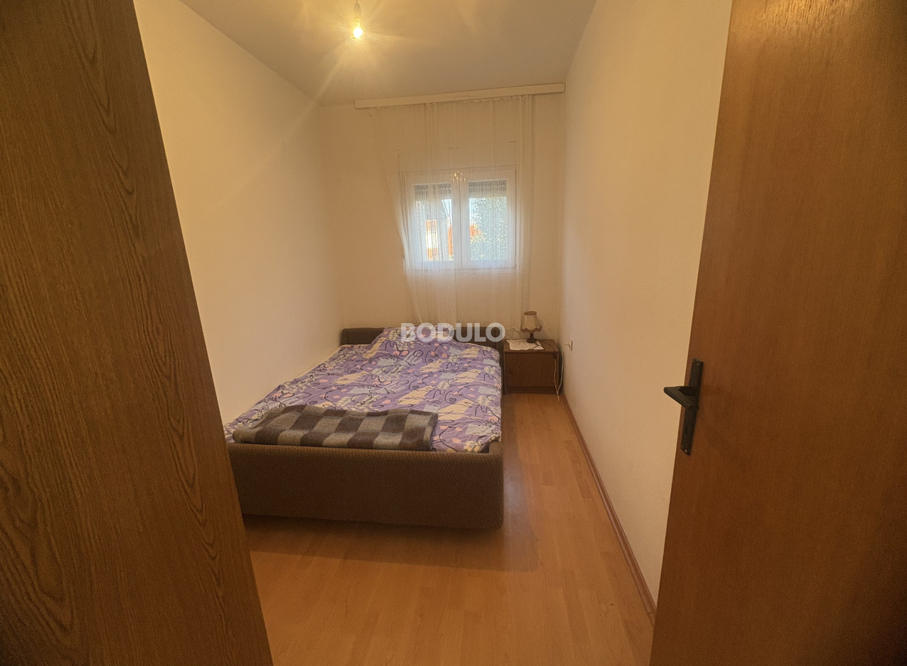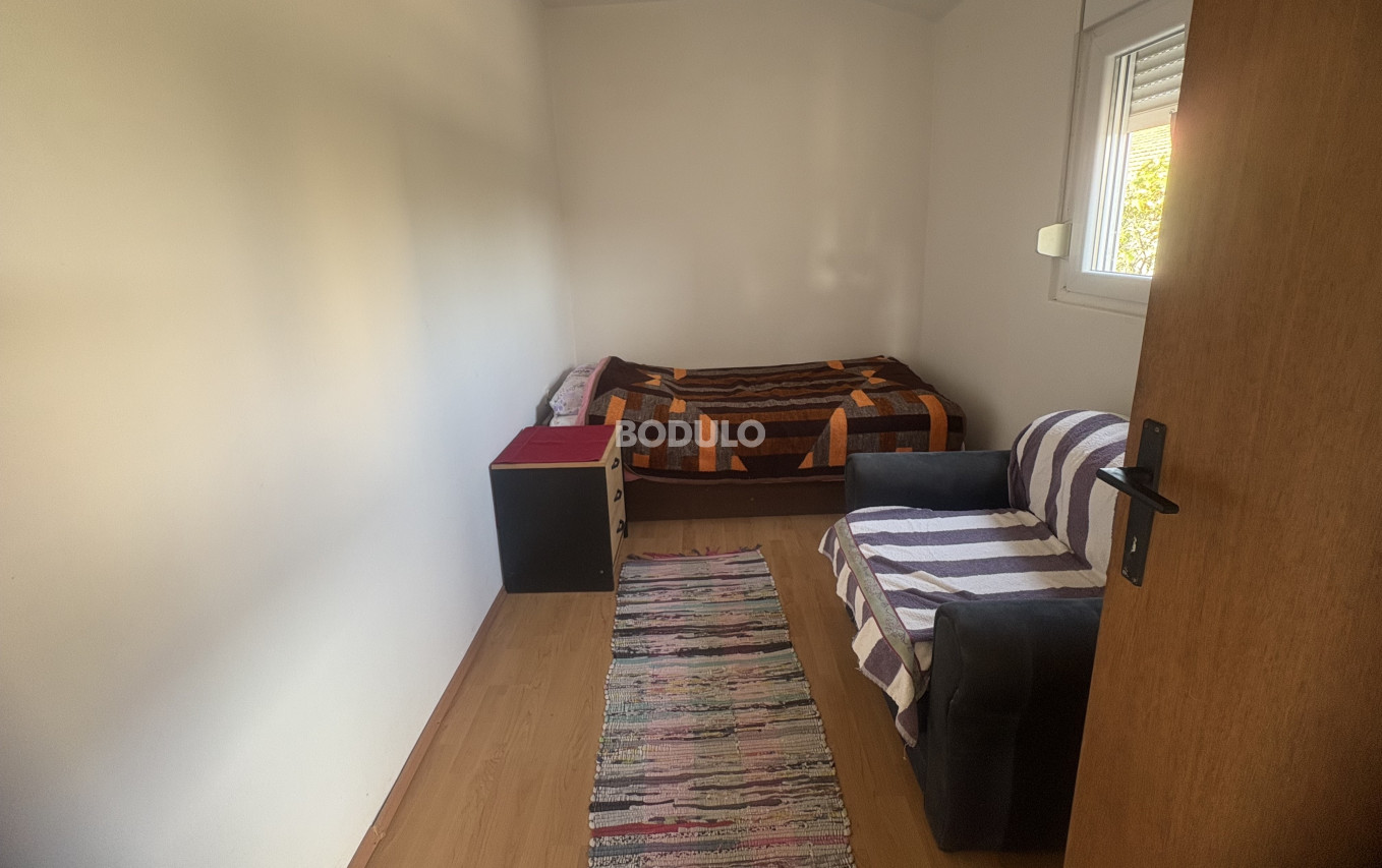 The house sits on a plot of 172 m² and consists of a ground floor and an upper floor, each with a separate entrance. On the ground floor, there is a one-bedroom apartment of approximately 40 m², comprising a bedroom, bathroom, a small kitchen, and a living room with access to the terrace and courtyard. The upper floor features a two-bedroom apartment of around 40 m², with a spacious partially covered terrace of about 45 m², offering a lovely view of the sea and the surrounding landscape. From this terrace, an external staircase leads to an additional rooftop terrace of 12 m², which offers an exceptional panoramic view of the sea, the Pašman Bridge connecting the islands of Pašman and Ugljan, and the village of Ždrelac itself.
