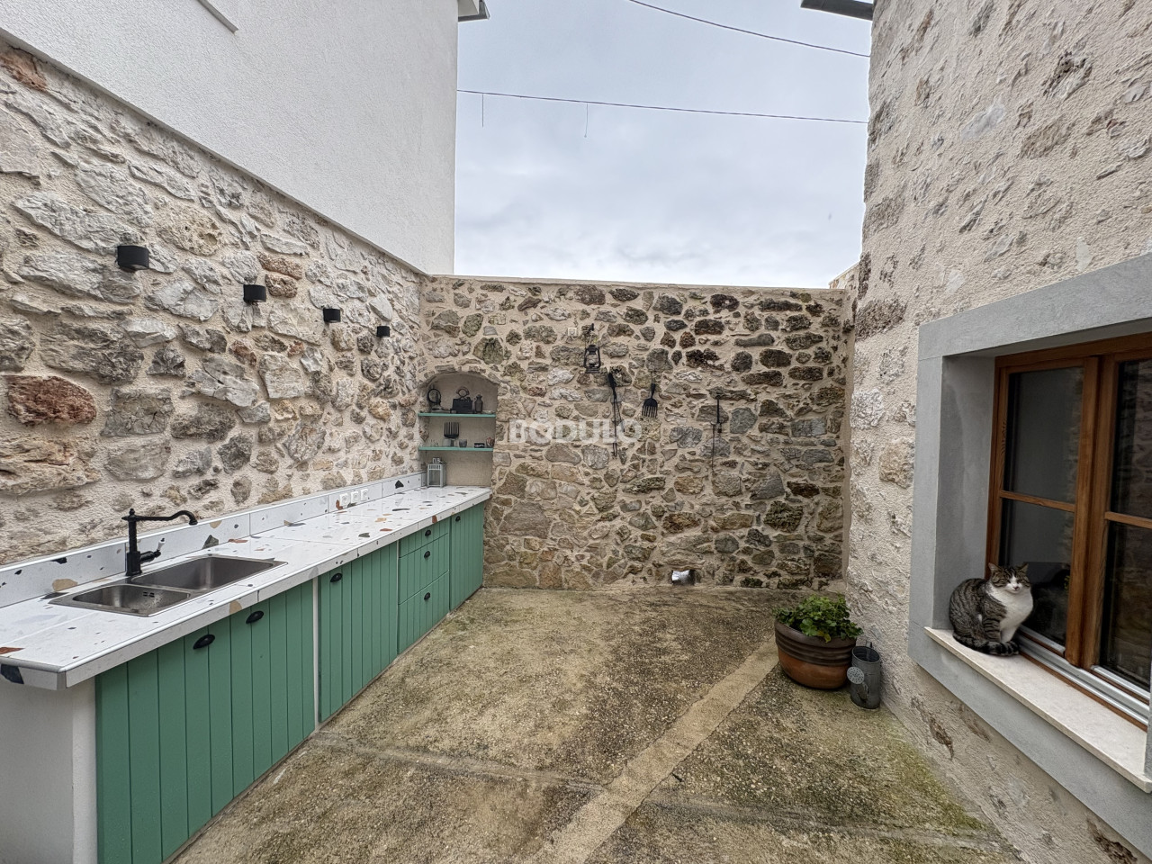 The courtyard is beautifully arranged – in the 56 m² stone section there is an outdoor kitchen, while the remaining 300 m² is used for parking space and a tidy, well-maintained garden, which further enhances the outdoor living experience. The property is characterized by traditional stone details and a peaceful location, while its proximity to the sea makes it particularly attractive.